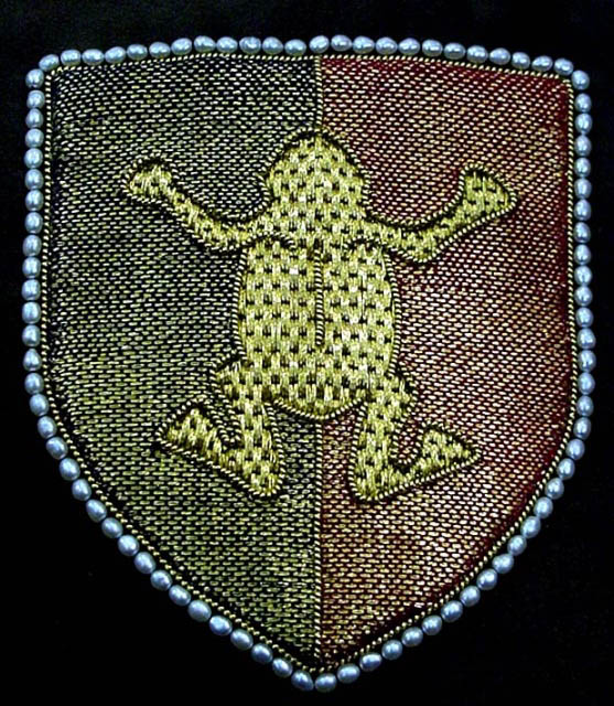 Worked in Japan gold, and blue and red silk on blue and red velvet ground, appliqued onto faux suede. The frog emblem has several layers of wool felt padding under the embroidery to “poof” it up. The frog is outlined with gold pearl purl, and the device is outlined in freshwater pearls.
