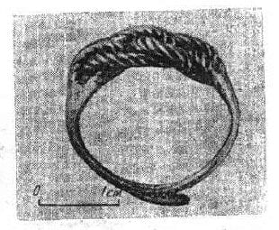 Illustration 46, item 15. Tied-off round-wire ring. This ring was found in a layer from the 1050s (Buja16-17-17 — Illus. 46:15). Its shield consists of a wire which has been wrapped into a spiral and then tied off on either side. Similar rings have been found in Vladimir and Uglich burial sites. A.A. Spitsyn dates those rings to the 11th century.[9]Izvestija Arkheologicheskoj komissii, 15 (1905), p. 320.