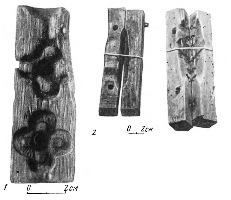 191 We are aware of 6 such molds. Three of them were found in Kiev (cf. Karger, Drevnij Kiev, Table XLVI), one in Grodno in a late 12th-century layer (cf. Voronin, op. cit., Illustration 34, item 13, p. 72). According to a kind note from O.V. Miloradovich, one side of a mold with placement rods used for casting rings was found in material from the time of the Golden Horde in the town of Madzhary (Stavropol’sk region). A fragment of one side of a mold of analogous form was found in the Nerevskij dig (cf. appendix below, item 2).
