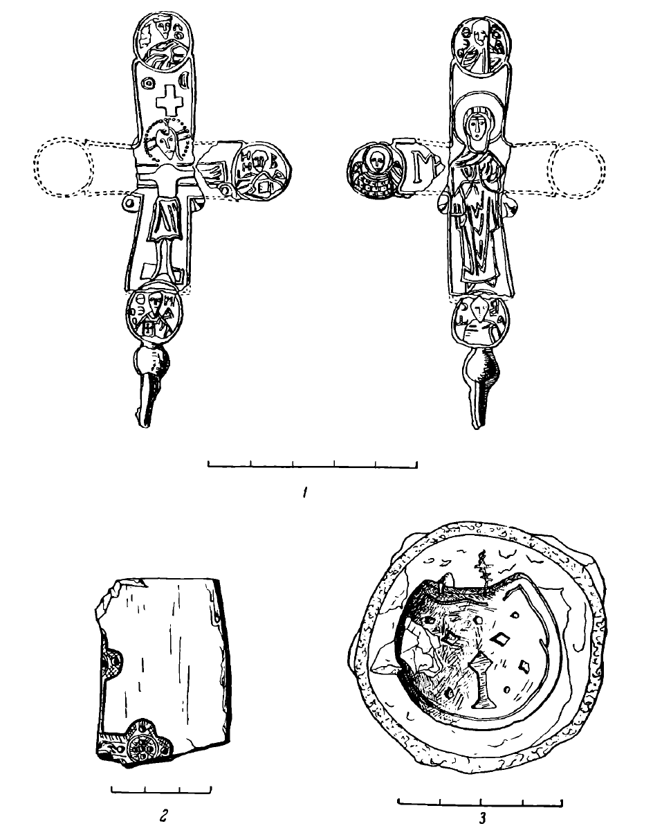 The collection of the State Russian Museum includes a lead, two-sided cross from the collection of N.P. Likhachev, which formerly served as the top of some unknown object. On the cross, there is a rough representation of the Crucifixion, orants, and saints in medallions with distorted inscriptions. All of the decorations and inscriptions are carried out in convex lines (Illustration 2, item 1).[17]Collection of the State Russian Museum, Inv. no. 13943, items a, b, v. Acquired from the Museum Fund on 18 Dec 1940. The location where it was discovered is unknown. In 1910, on the land of the Church of the Tithes manor, D.V. Mileev discovered a mold (fragment) with the image of a cross; the center of the cross appears to have depicted the Crucifixion (the hands are visible); the ends of the cross were of simple design. All of the imagery was done in carved lines, which when cast would become convex. In appearance, an item cast in this mold would have been similar to the lead cross from the Likhachev collection.