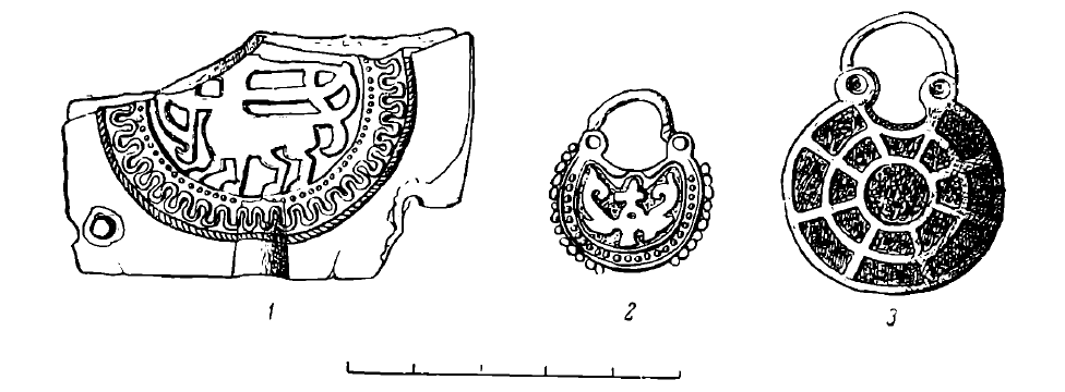 A cast, bronze, star-shaped pendant was found on Knjazha Gora. It was small and simple in comparison to the smart, star-shaped kolts embossed in silver found in treasure troves. The rays of this semblance of a star-shaped pendant are covered in pseudo-granulation, and on the tips there are small spheres (Illustration 1, item 1).[13]Khanenko, 1902, Table XVII, item 357; Collection of the Kiev Historical Museum, Inv. nos. 66107 and 13805.