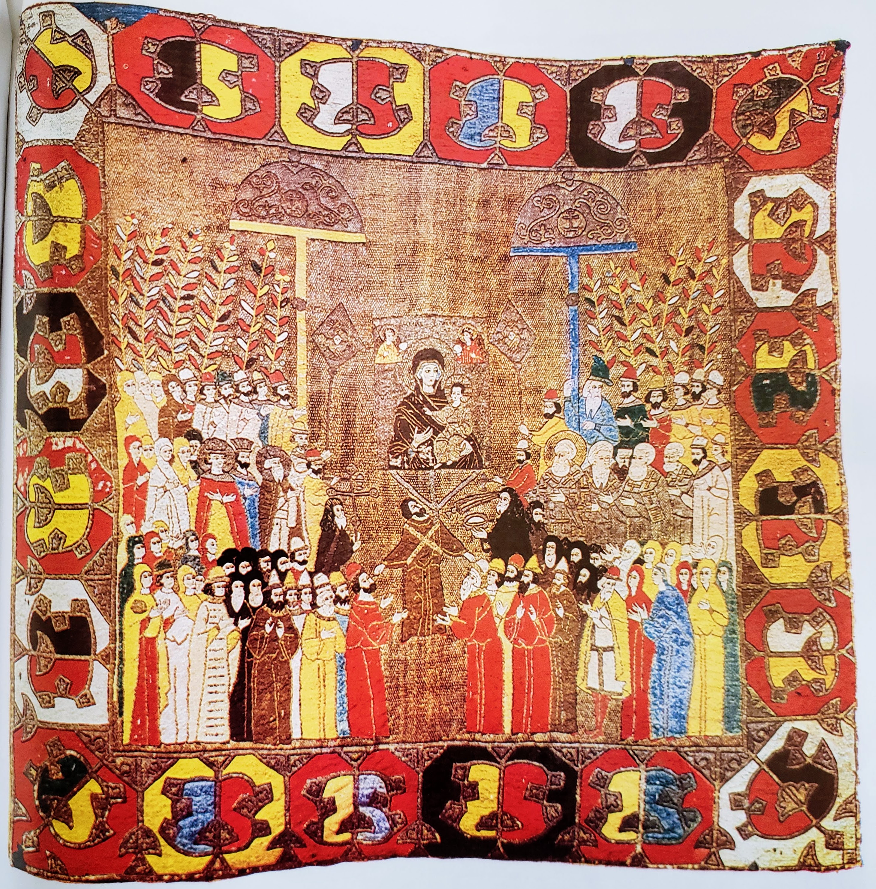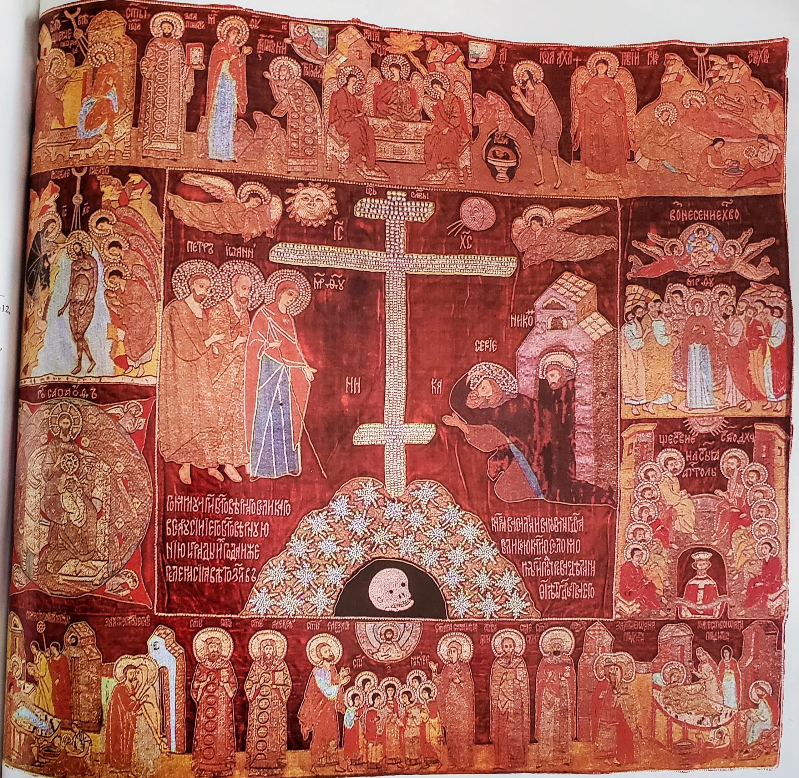 | ↟73 | jeb: The Deësis Row is a part of the iconostasis in an Orthodox Christian church. It is typically located immediately over the Royal Door through the iconostasis, with Christ sitting immediately over the door, flanked by the Virgin Mary and John the Baptist, often along with other saints or angels depicted in full-length. In this case, the Deësis Row was presumably part of a larger embroidered iconostasis. |