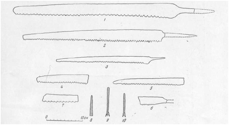 1-12th cent. anvil (18-25-725); 2-hammer, late 11th cent. (20-29-738); 3-hammer, 11th cent. (23-22-611); 4-chisel, 11th cent. (22-24-876); 5-pliers, late 15th cent. (3-4-525); 6-pliers, 14th cent. (7-11-1128); 7-tongs, 11th cent. (25-24-522); 8-tongs, 11th cent. (23-23-955); 9-tweezers, type A, 12th cent. (18-20-1049); 10-tweezers, type B, 12th cent. (16-19-866).
