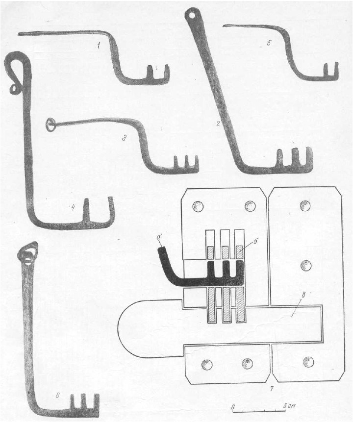 In the Nerevsky dig, 15 sets of tweezers have been found, of which 8 were of the first type, and 7 were of the second. The construction of the first type of tweezers is very simple; their construction can clearly be seen from illustration 7, 9. These tweezers differed in terms of size, from large (120 mm long) to small (60 mm long). The were found in layers from the 10th-14th centuries (26-20-689, 23-22-503, 18-20-1049, 16-21-252, 12-17-364, 11-16-4, 7-10-868, and 16-22-73).