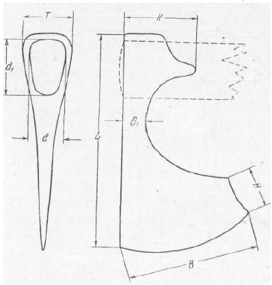 The second hammer (23-22-611) is of the same construction, but is somewhat elongated and is simpler in form (illustration 7, 3). This hammer is 70 mm long, with a flat head 13 x 7 mm, a claw that is 11 mm wide, and the small hole for the handle is 10 x 6 mm. This hammer weighs 34 g.