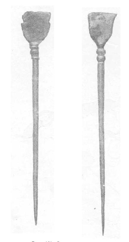 The construction of the second type of tweezers is more interesting. Their form, size (in millimeters) and location by layer is shown in table 3. Tweezers of this second type are used as a sort of manual vise. Having grasped a small item (thin plate, wire, etc.) in the jaws, the artisan would be able to easily work upon it.